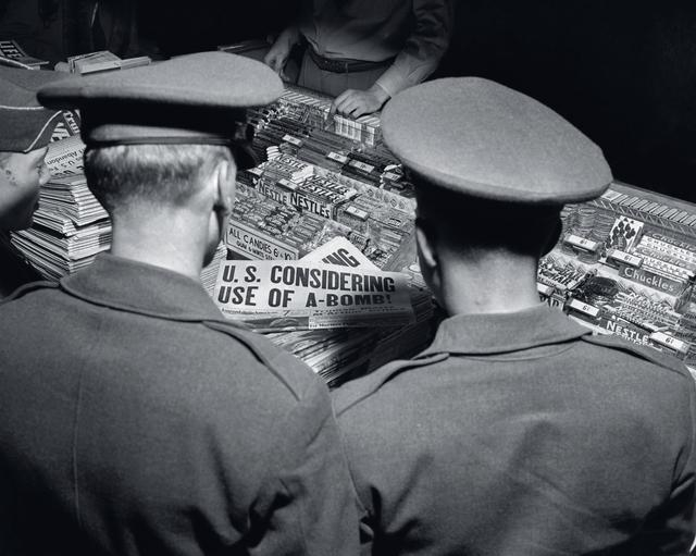 1950年11月30日,两名军官正在纽约中央车站围观刊有《美国考虑使用原子弹》 头条的新闻报纸。二次战役爆发后,美军特别是精锐陆战1师惨败的消息震撼了美国,杜鲁门在记者招待会上甚至语无伦次地扬言要对志愿军及中国使用原子弹。来源/视觉中国