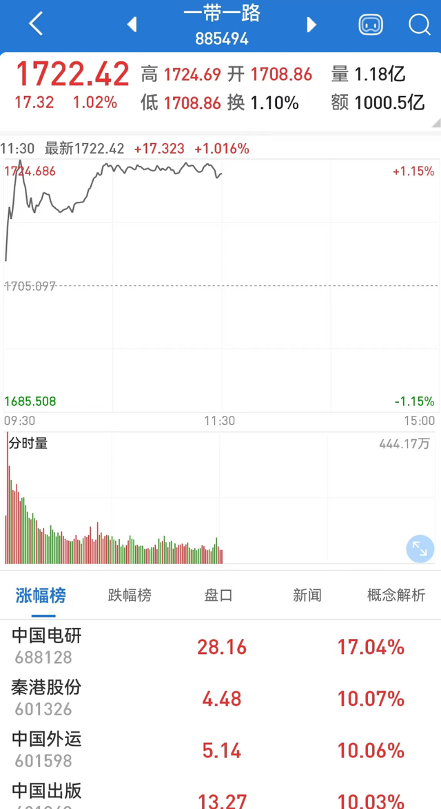 一带一路板块早间放量高开高走,盘中大涨逾3%,创2015年6月以来近8年新高,半日成交接近前一交易日全天成交。秦港股份一字涨停,这已是该股近期连续第4次涨停,股价创4年多新高;中国出版亦连续3涨停,近1个月来共收获7个涨停,期间累计大涨逾120%;中国海诚、铁龙物流、设计总院等逾10股也涨停或涨超10%。