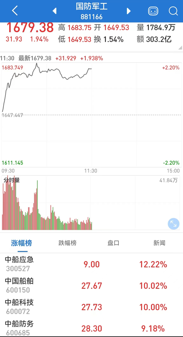国防军工股早盘再次集体拉升,船舶板块一马当先,盘中放量飙涨逾8%,创近3年来新高,半日成交超前一交易日全天成交。板块内所有个股上涨,中国船舶、中船科技强势涨停,中船防务、中国动力等亦逼近涨停。