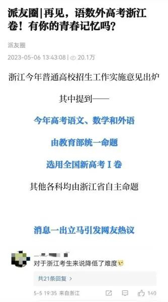 日前出台的浙江今年普通高校招生工作实施意见,这两天在网友中引起了一波回忆热潮。意见明确了今年考高的时间为6月7日-10日,并再次提到,今年浙江高考语文、数学和外语由教育部统一命题,选用全国新高考Ⅰ卷。这是自2004年浙江高考自主命题后,时隔近20年重回全国卷。网友们因此纷纷回忆起了自己曾经的高考试卷。其中,有一个说法引起了大家的关注,那就是,使用全国卷,对浙江考生来说,难度是不是降低了?