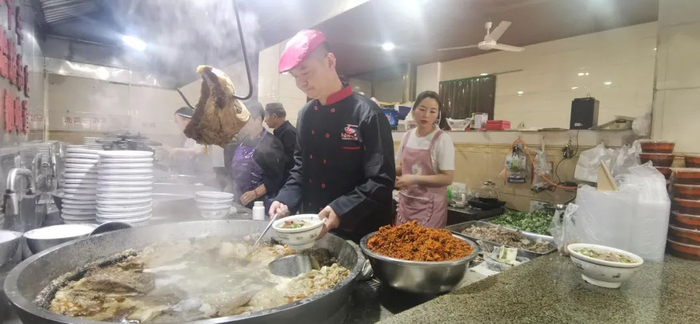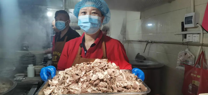 他和妻子刘巧敏每天早晨5点开始忙碌,把羊肉配以草果、桂皮、肉桂、八角、茴香、胡椒、枸杞等十余种作料进行熬制,待高汤沸腾时,食客们也陆续到来。