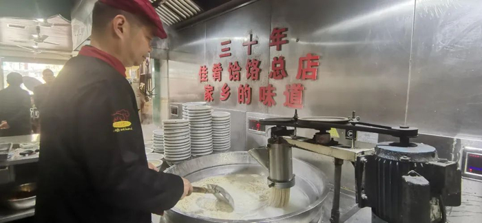 李炯在店里煮面浇汤