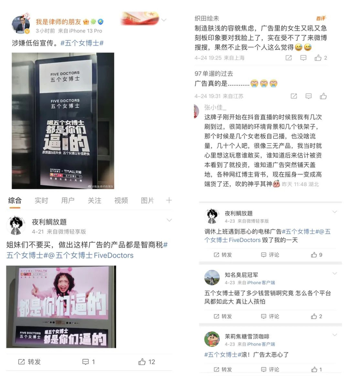 “喝五个女博士,都是你们逼的”。4月,口服美容品牌“五个女博士”投放的一则广告文案引起争议,被指涉嫌内涵女性。对此,网友发表评论称:制造肤浅的容貌焦虑,广告里的女生又吼又急的刻板印象要怼我脸上了。也有法律博主表示:涉嫌低俗宣传。