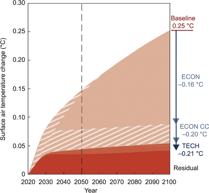 图3. 预计到2100年,石油和天然气行业对全球变暖的贡献为0.25 ℃。若采取经济可行的(ECON)净零成本方案(如防止甲烷泄漏),到2100年全球变暖幅度可减少0.16 °C;如果目前公司作出的承诺(ECON CC)得到履行,该幅度可增至0.20 °C。如果石油和天然气行业也采用现成的技术(TECH)来避免净零成本选项(ECON CC)外引起的升温,则可以累计避免0.21 ℃的增温。来源:《环境研究快报》(CC BY 4.0)。