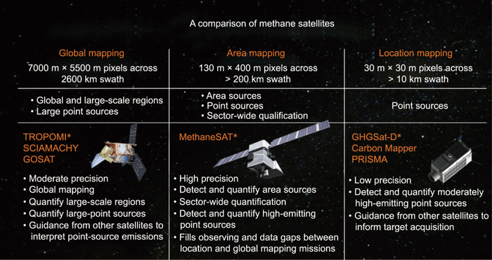 图4. 在轨和即将发射的甲烷探测卫星能力比较图。MethaneSAT和首批两颗Carbon Mapper卫星预计将于2023年进入轨道。SCIAMACHY:大气制图用扫描成像吸收光谱仪;GOSAT:温室气体观测卫星;GHGSat-D:温室气体卫星-演示器;PRISMA:意大利高光谱先导应用卫星。来源:MethaneSAT(经许可)。