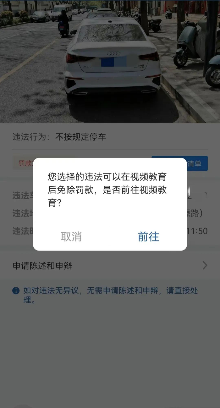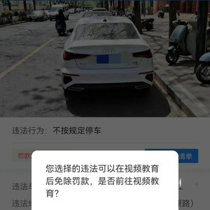 周先生打开“违法处理”页面确认违法行为:“不按规定停车”。此时,页面弹出了一个提示窗口:“您选择的违法可以在视频教育后免除罚款,是否前往视频教育?”