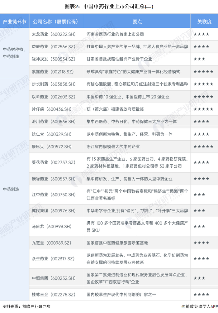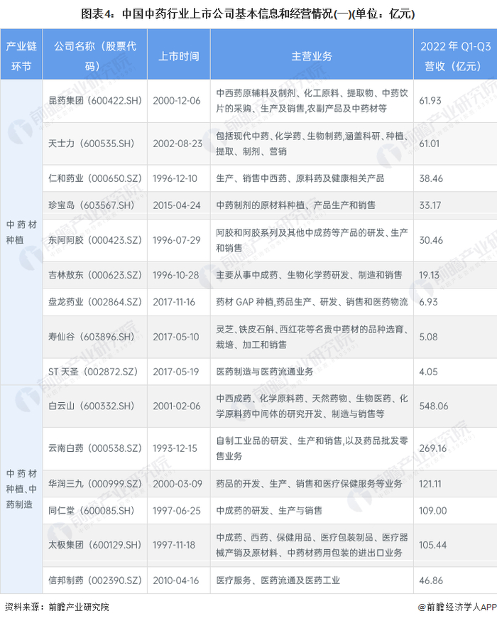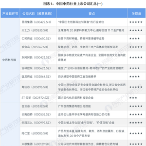中国中药行业发展历史悠久,行业的发展培育出多家上市企业。整体来看,中国中药行业企业产业链布局较为完善,大型中药制造生产企业积极向上游拓展,建设中药材种植基地,一体化程度较高。我国中药行业上市公司较多,具体包括: