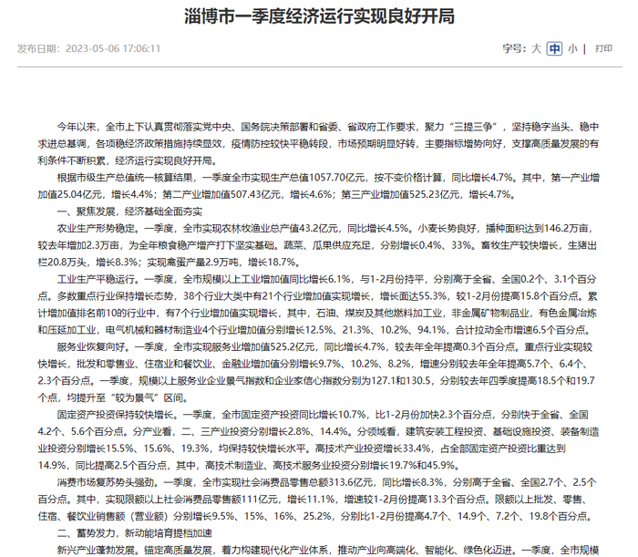 淄博市统计局网站近日发布数据显示,根据市级生产总值统一核算结果,一季度全市实现生产总值1057.70亿元,按不变价格计算,同比增长4.7%。其中,第一产业增加值25.04亿元,增长4.4%;第二产业增加值507.43亿元,增长4.6%;第三产业增加值525.23亿元,增长4.7%。其中,消费市场复苏势头强劲。