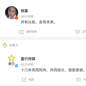 5月8日,演员杨幂通过个人微博发文官宣与嘉行传媒结束合作关系。同时,嘉行传媒发文:“十几年风雨同舟,共同成长,感恩感谢。祝未来一切顺利,珍重安好。”随后,“杨幂官宣与嘉行解约”冲上微博热搜榜首。