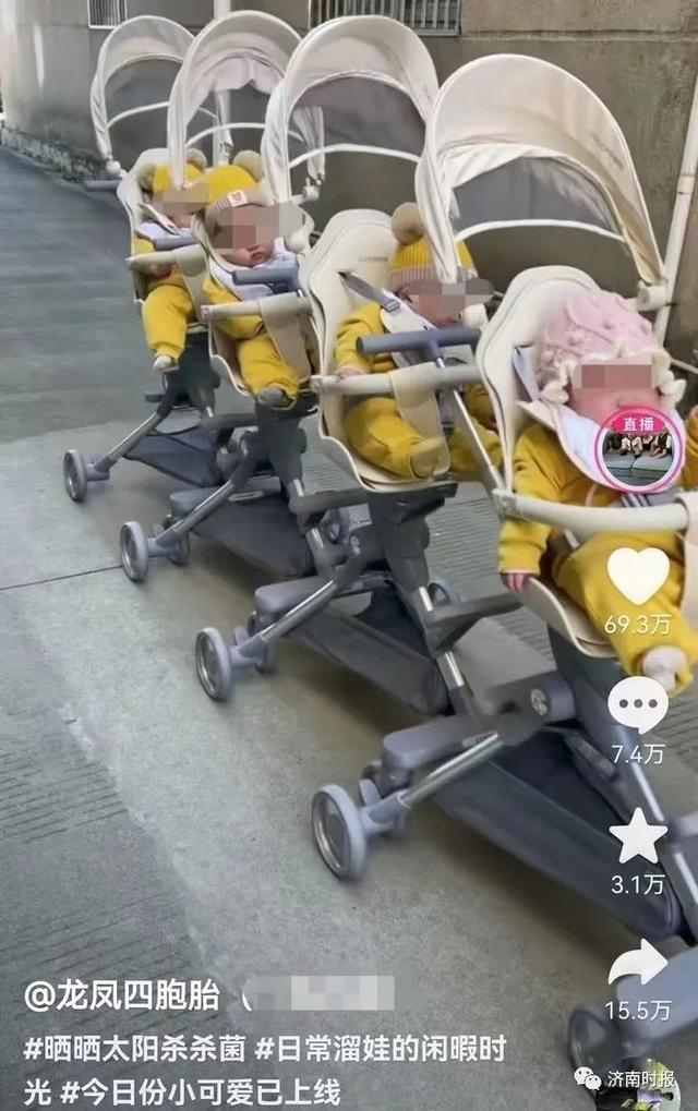 四胞胎出生后,郝女士和丈夫给四个宝宝取了名字,四个宝宝名字中分别拿出一个字连起来就是“一帆风顺”。夫妻二人还在短视频平台开通了账号,经常分享四个宝宝的日常生活状态和趣事,一家人其乐融融的生活,吸引了不少网友的观看,目前在某平台粉丝量达到70多万。为了增加家庭收入,她也在平台开直播带货,渐渐有了一些收入。