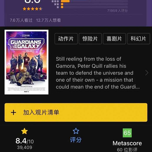 豆瓣开分8.6、IMDB 8.4,在经历了整个第四阶段的持续低迷、第五阶段《黑豹2》《蚁人3》同样的开局不利之后,《银河护卫队3》非但没有延续颓势,反而捅破了漫威的口碑天花板——即便是大名鼎鼎的《复仇者联盟4》在豆瓣也仅仅8.5分,在IMDB与它持平。