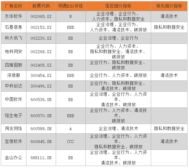 通过各细分议题指标的表现来看,12家软件服务商主要在企业治理、人力资本和碳排放上落后于全球同业水平。其中,石基信息和用友网络在隐私和数据安全方面领先,东华软件、深信服和宝信软件在清洁技术上领先。