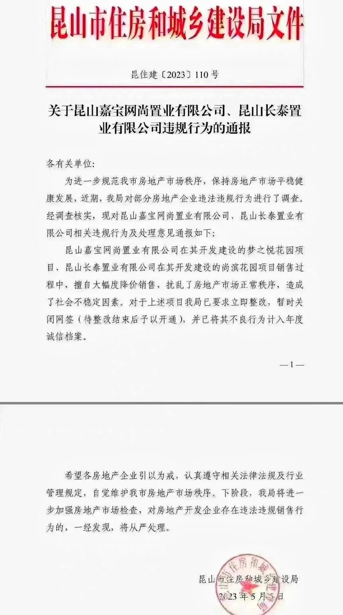 5月6日,网上传出一份由江苏省昆山市住房和城乡建设局下发的《关于昆山嘉宝网尚置业有限公司、昆山长泰置业有限公司违规行为的通报》的文件。