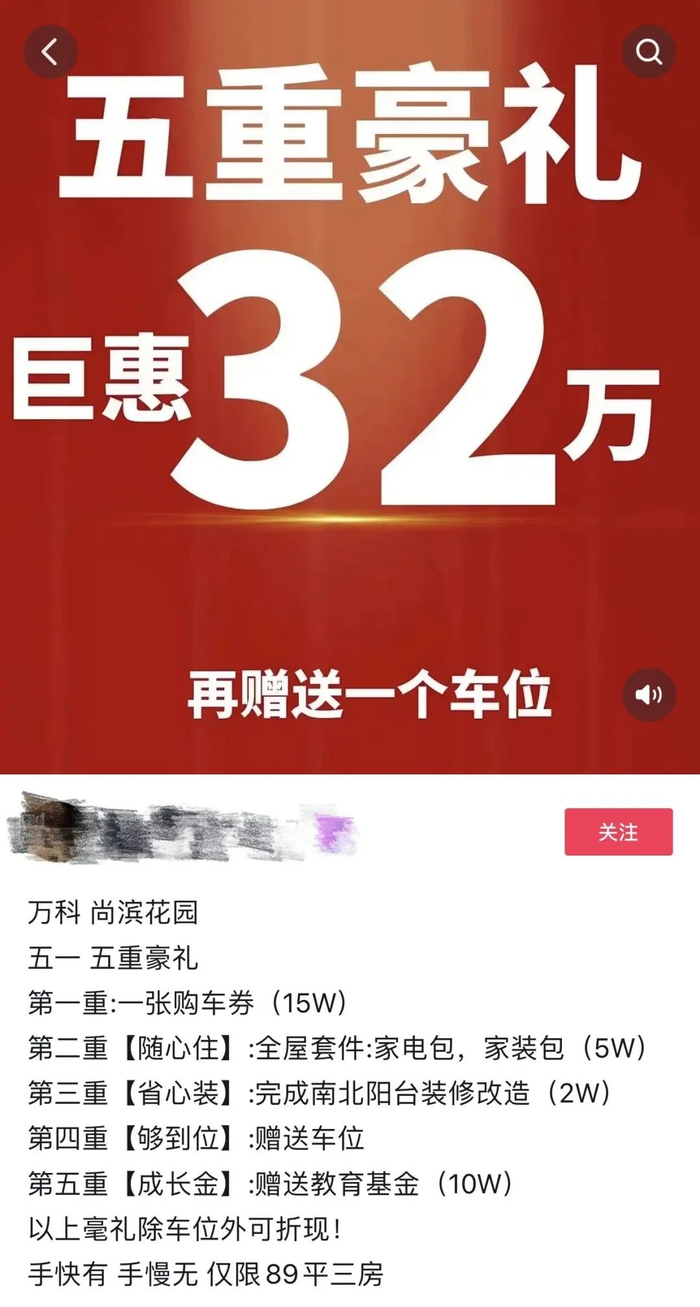 而这之前,相关代理销售称,上述项目推出“五一五重豪礼”,巨惠32万元,再赠送一个车位,“本身房子原价就160万元左右,优惠了三十来万,再送个车位,力度很大”。