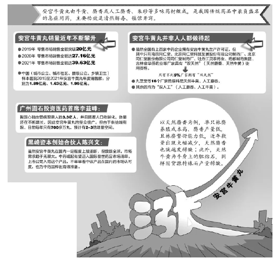 第三,错位竞争。陈兴文分析,虽然人工药材代替天然药材的药效差别很多,但针对心脑血管的基础功能主治效果应该差不多,出于平日保健需求,人工的安宫牛黄丸也能满足需求。因此,针对不同消费需求和消费能力的人群,天然与人工的安宫牛黄丸有各自的市场。“人工取材的安宫牛黄丸生产企业依旧可以满足大部分中低端需求,这块需求占比也很大,市场延展力值得想象。”