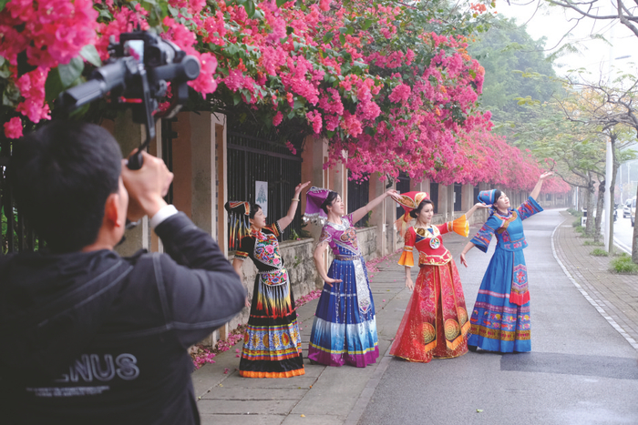三角梅花开如瀑,市民特意穿上民族服饰拍照