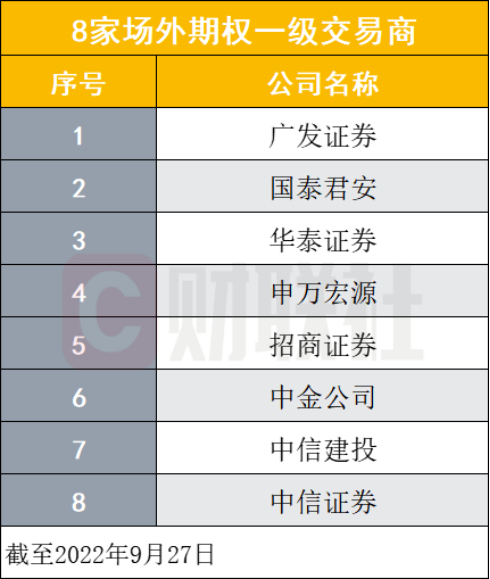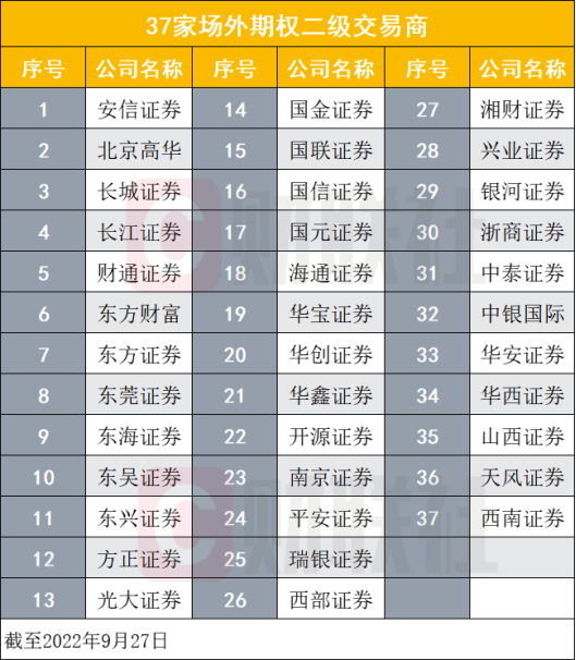 中证协公布的最新一期场外期权交易商名单显示,截至2022年9月27日,全市场共有45家券商是场外期权交易商,其中一级交易商8家,二级交易商37家。