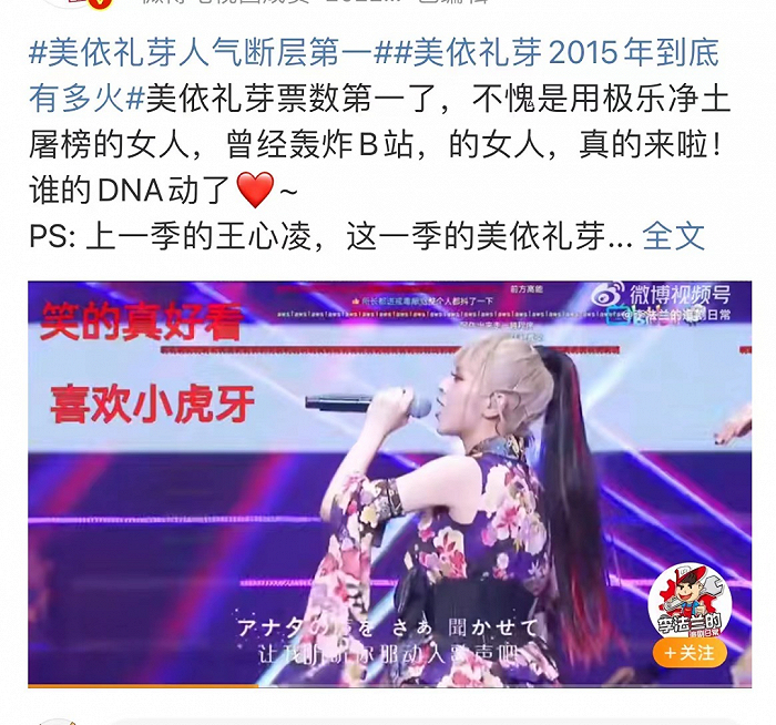 #美依礼芽人气断层第一#被刷上微博热搜,曾经血洗B站的《极乐净土》终于迎来了原唱,而这位国际姐姐也因为用心的舞台准备和强大的情怀加持,有望成为这一季“浪姐”令人惊艳的存在。曾经的王心凌男孩、如今的二次元宅男,两个不属于“浪姐”核心粉丝群的群体,助推了这两场出圈浪潮,何其相似。