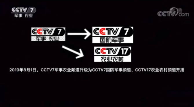 CCTV-7军事·农业频道,正式变更为“CCTV-7国防军事频道”和“CCTV-17农业农村频道”。