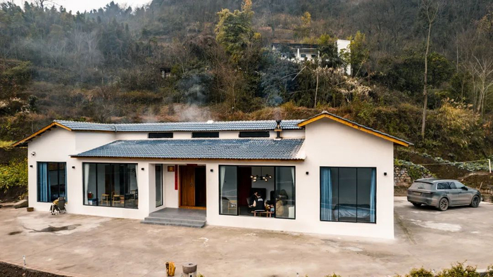 2年多时间,昔日破旧的老屋焕然新生——因为地基背靠大山,并紧邻马路入口,不适合打造四合院,便修成了这栋蓝瓦白墙的独栋楼。楼内共140㎡,有堂屋、客厅、餐厅、厨房、四个卧室、两个卫生间、一个储藏间。落地玻璃和天窗的设计,将大自然引入屋内,不再像旧时那样黑漆漆一片。屋内还配套了智能家电系统,让老父亲在大山里也能坐拥智慧化生活。