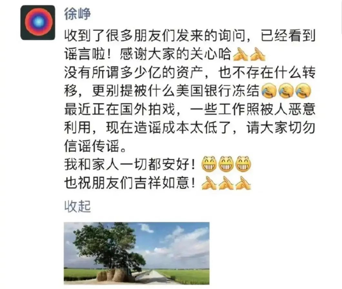 徐峥表示,“自己没有所谓多少亿的资产,也不存在什么转移,更别提被什么美国银行冻结,最近正在国外拍戏,一些工作照被人恶意利用,现在造谣成本太低了,请大家切勿信谣传谣。我和家人一切都安好!也祝朋友们吉祥如意!”