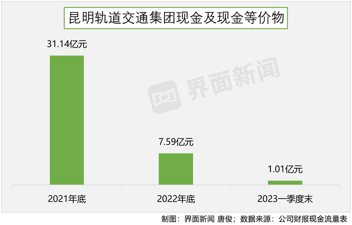 昆明地铁真的缺钱了,其现金存量正在急速下滑。财报显示,2021年底时,昆明轨道交通“现金及现金等价物”还有31.14亿元,到了2022年末就只有7.59亿元了。而今年一季度末,公司“现金及现金等价物”仅剩1.01亿元,一年多时间减少了30亿元。