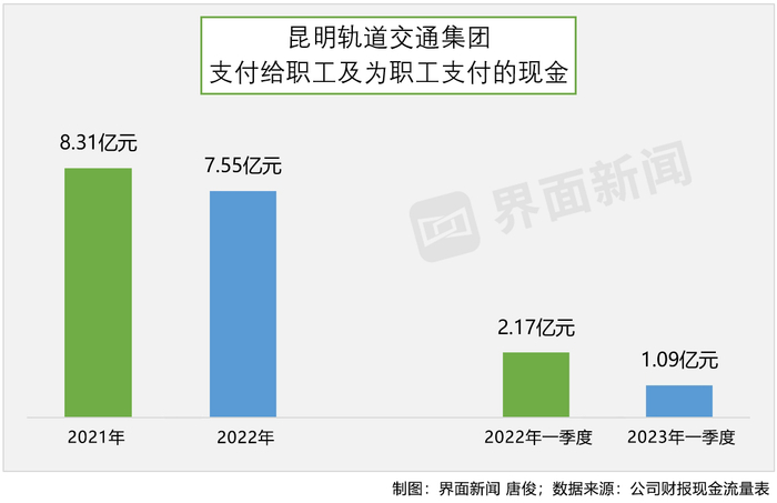 现金流量表显示,昆明轨道交通“支付给职工及为职工支付的现金”也在减少。2021年全年数额为8.31亿元,到2022年只有7.55亿元。2022年一季度“支付给职工及为职工支付的现金”为2.17亿元,到今年一季度只有1.09亿元,直接“腰斩”。根据《企业会计准则》,“支付给职工以及为职工支付的现金”包括职工的工资、奖金、津贴和补贴、福利费以及五险一金等。
