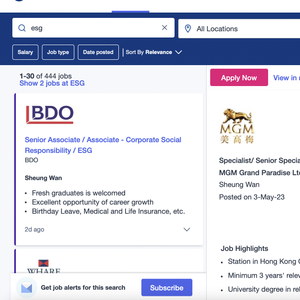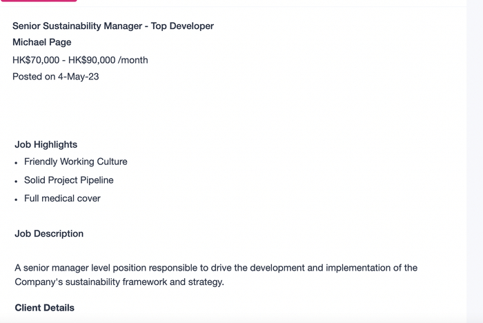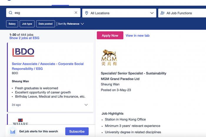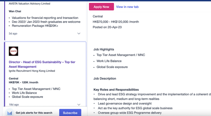 记者在香港最大的求职网站上看到,ESG资深经理一职的月薪为7-9万,头部资产管理公司ESG总监职位月薪为7-12万,而更初级一些的职位月薪多为3-5万。
