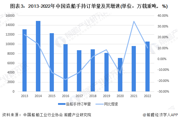 2013-2020年,我国造船手持订单量呈现震荡向下走势,2021年开始回升。2022年,中国造船手持订单量10557万载重吨,同比增长10.2%。