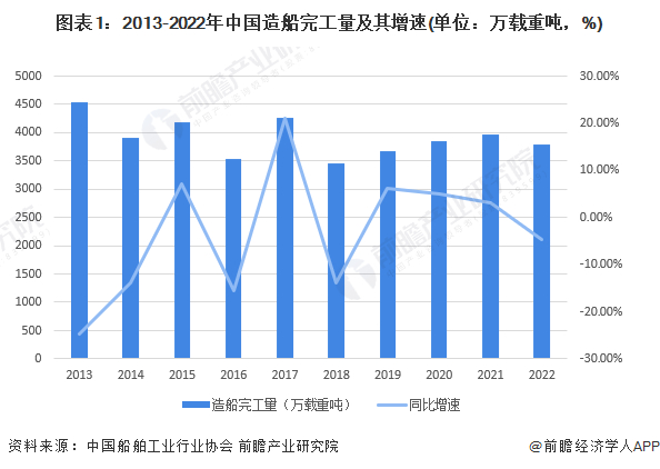 2013-2022年,我国造船完工量呈震荡趋势。2022年,世界疫情冲击依然存在,叠加能源危机,我国船舶制造行业长期问题与短期冲击并存,造船完工量3786万载重吨,同比下降4.6%。