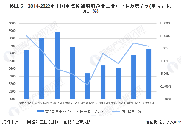 注:1)重点监测船舶企业工业总产值统计口径不同,仅在除1 2月外的其他月份每月公布,故每年最多统计1-11月情况;2)每年重点监测船舶企业数量略有不同,2014-2022年重点监测企业数量分别为87、88、94、80、80、80、80、75、75和75家,故同比增速会根据企业数量进行相应调整。