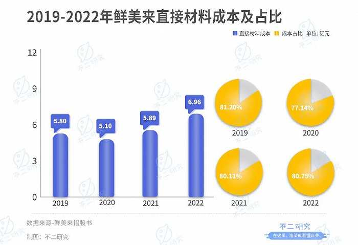 「不二研究」认为,由于鲜美来业务发展受制于上游,其毛利率很大程度上受到原材料采购费用的拖累。根据招股书,2019-2022年,鲜美来采购的直接材料分别为5.80亿元、5.10亿元、5.89亿元和6.96亿元,在主营业务成本中的占比分别为81.20%、77.14%、80.11%和80.75%。