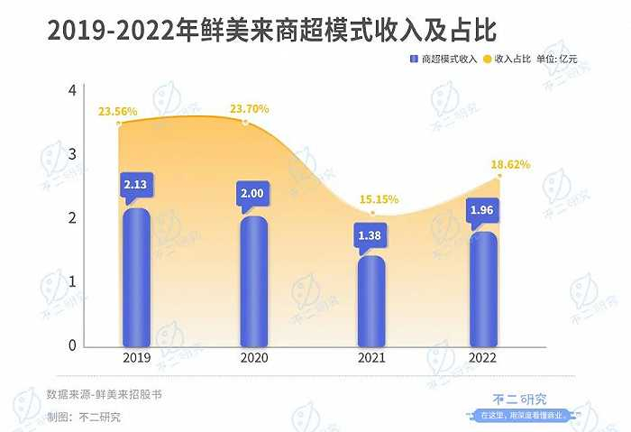 但C端市场的扩容绝非易事。招股书显示,2019-2022年鲜美来商超模式收入占比分别为23.56%、23.70%、15.15%和18.62%,呈下滑趋势。