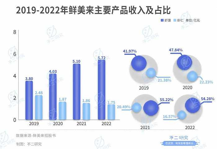 招股书显示,鲜美来的主要产品包括两大类:以虾滑等为主的即烹类预制菜,以虾仁、生鱼片等为主的即配类预制菜。其中虾滑是鲜美来的收入支柱,2019-2022年虾滑的收入分别为3.80亿元、4.03亿元、5.10亿元和5.72亿元,占比41.97%、47.84%、56.22%和54.28%。虾仁和生鱼片紧随其后,2022年分别贡献16.57%和14.76%的收入。