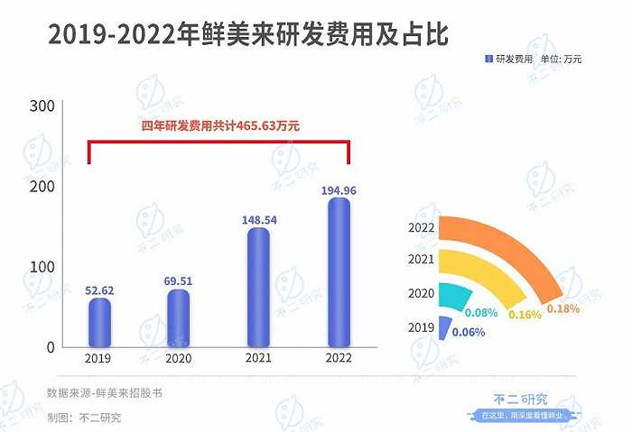 新品的开发势必要加强研发投入。根据招股书,2019-2022年,鲜美来的总研发支出只有465.63万元,占营业收入的比例分别为0.06%、0.08%、0.16%和0.18%。