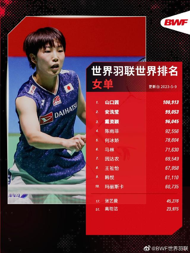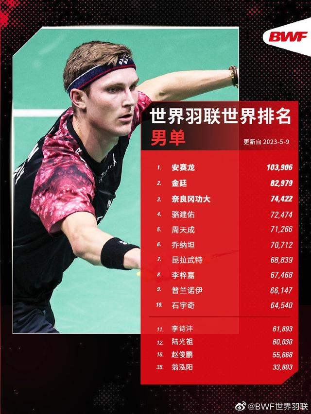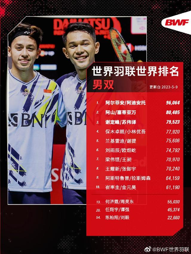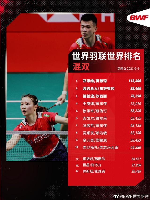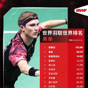 据BWF世界羽联消息,截止至2023年5月9日世界羽联各单项世界排名: