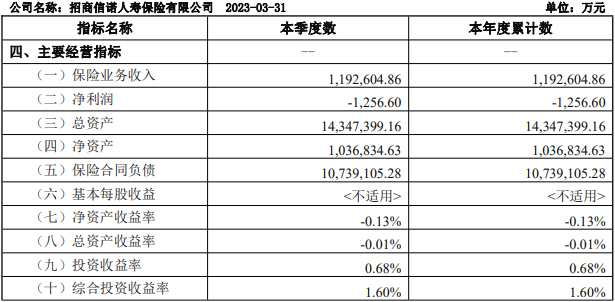 2023年1-3月,招商信诺实现保险业务收入119.26亿元,上年同期为94.10亿元;实现净利润-1256.60万元,上年同期为2.21亿元;总资产收益率-0.01%;净资产收益率-0.13%;综合投资收益率1.60%;投资收益率0.68%。