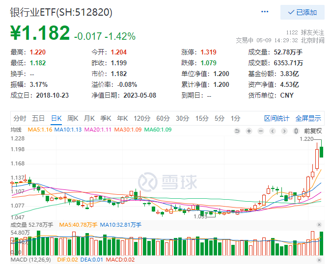 以主流的银行业ETF(512820)为例,5月9日其场内成交额大幅放量,盘中成交额超6300万元;且盘中频现溢价交易,买盘情绪或乐观。
