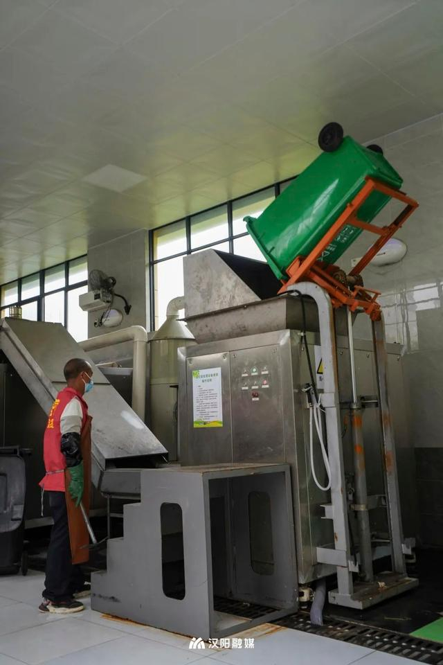 汉阳君看到,收集屋内,肖海香师傅正忙着将装有厨余垃圾的绿色垃圾桶推到一台厨余垃圾处理设备前,挂桶、倾倒、破碎……当天收运而来的100多公斤厨余垃圾,通过传送带,送到设备的“肚子”里,进入发酵仓内。