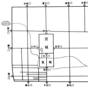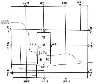 金中都中轴线的南端,起自大城南墙正中的丰宜门。由此向北,沿着居于城市正中的交通干道,先过龙津桥,再经永乐坊、广阳坊,通过环绕皇城西、南两面的金水河,到达皇城正南门——宣阳门。由宣阳门进入皇城,穿过千步廊,到达宫城正南门——应天门。进入宫城后继续向北,由大安门进入大安殿,再从宣明门出大安殿;随之又经仁政门、仁政殿、昭明宫、昭明门,至皇城北门——拱辰门。由此走出皇城后,穿过天王寺、弘法寺之间的南北向交通干道,抵达基本位于大城北墙正中的通玄门。这样,以丰宜门与通玄门为南北端点,金中都的中轴线清晰地显现出来,突出了帝王所居之地在全城的中心地位。