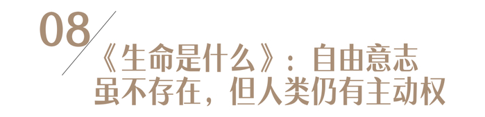 第二本《生命是什么》,这本书能让我们比较完整地了解生命的起源,地球到底是怎样从完全没有生命到出现氨基酸、蛋白质,然后慢慢组成生命,从单细胞走向多细胞生物,以及人是怎么变成智慧动物并产生自我意识,人类到底有没有自由意志等等。