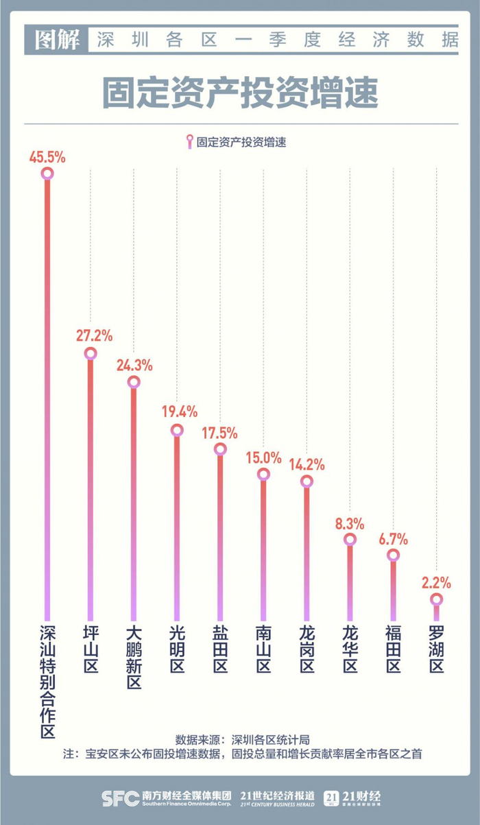 同时,宝安区一季度完成固定资产投资252.76亿元,占全市的18.1%,对全市固投完成额的增长贡献率达33.5%,固投总量和增长贡献率均居全市第一。