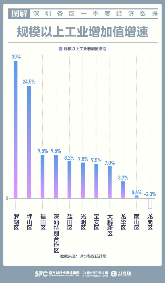 龙岗方面,一季度GDP达1083.85亿元,同比增长3.2%。全区规模以上工业企业增加值同比下降2.3%,降幅较1-2月收窄6.2个百分点。