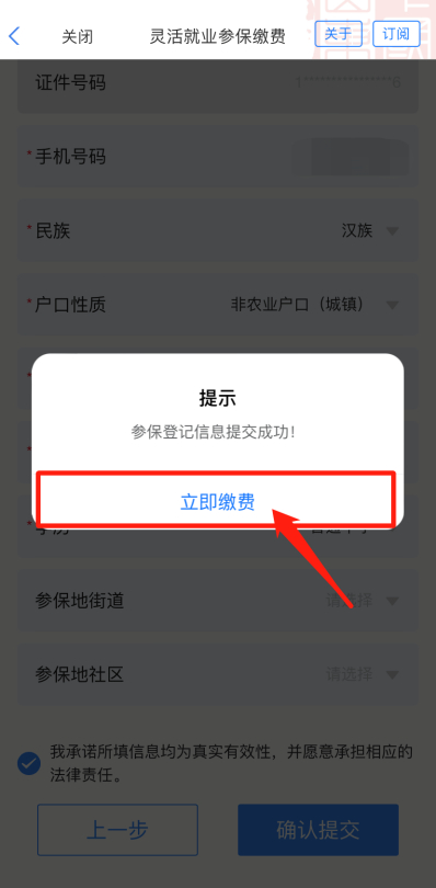 4、提交成功后,点击页面中的立即缴费,即可进行社保费缴纳,根据自身需要,选择“医保自主申报”或“人社自主申报”,增加人员后进入下一步,选择缴费基数、险种、费款所属期起止时间后缴费即可。