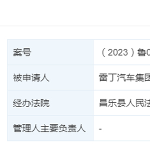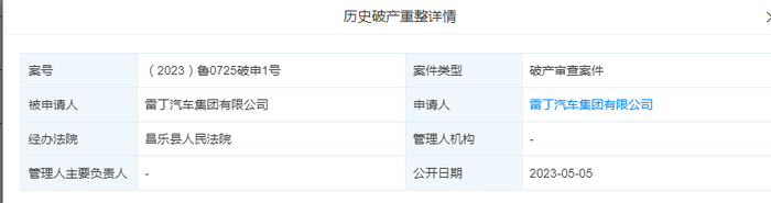 日前,雷丁汽车集团有限公司新增一则破产审查案件。破产申请和被申请人均为雷丁汽车,经办法院为山东省潍坊市昌乐县人民法院。