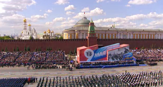 我们站在红场上,在这片土地上,我们铭记尤里·多尔戈鲁基大公和德米特里·顿斯科伊大公曾率领的人员、米宁和波扎尔斯基曾率领的民兵、彼得大帝和库图佐夫曾率领的士兵、1941 年和 1945 年的阅兵式。