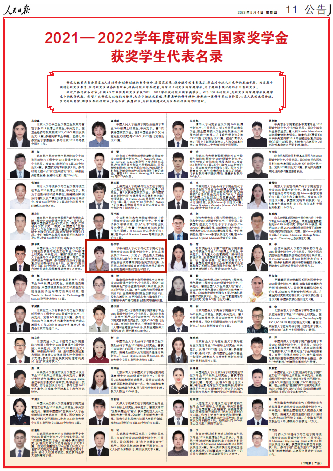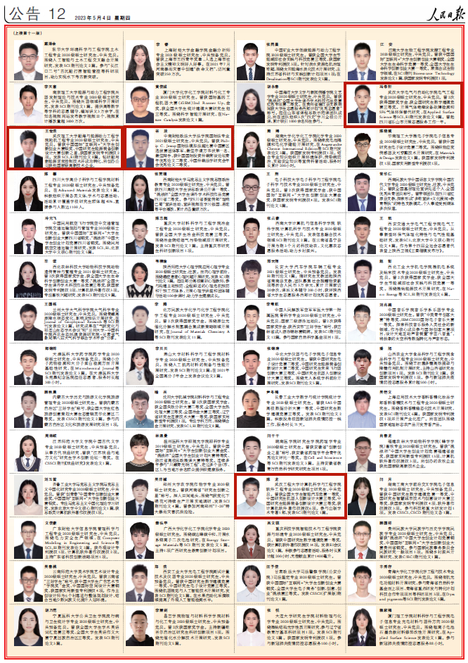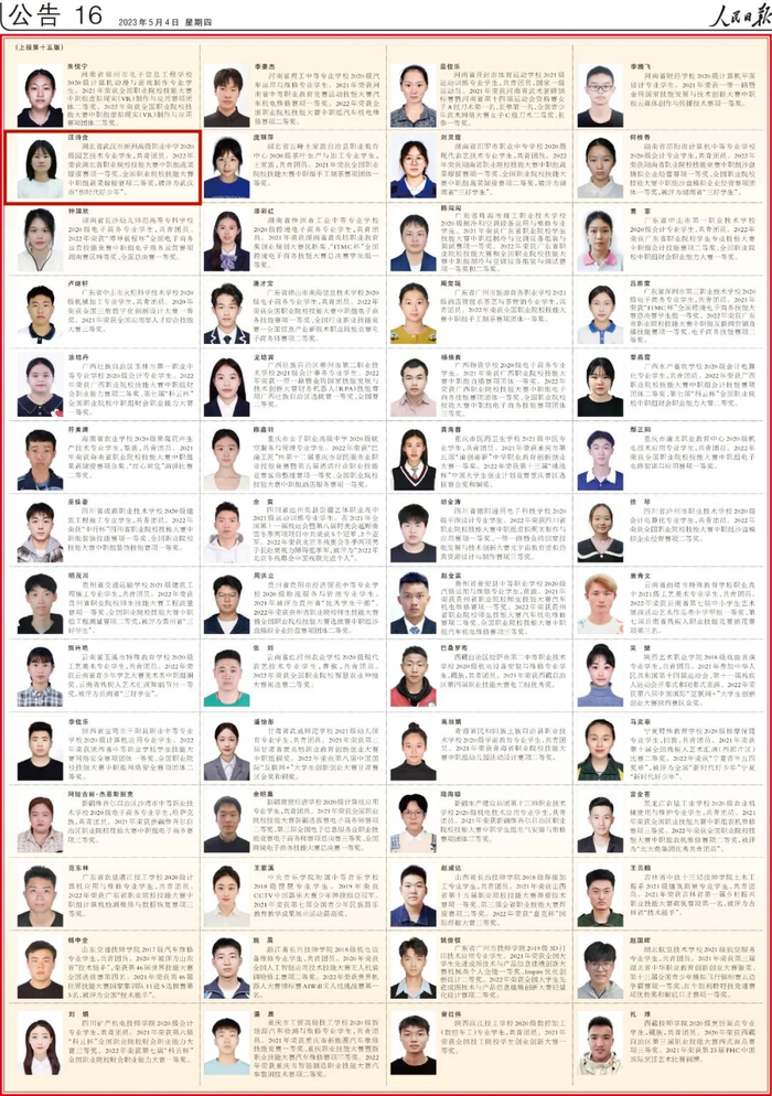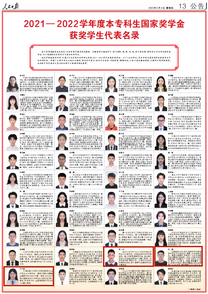 5月4日出版的《人民日报》,用六个整版刊登了100名研究生国家奖学金获奖学生优秀代表、100名本专科生国家奖学金获奖学生优秀代表和100名中等职业教育国家奖学金获奖学生优秀代表名录。其中,武汉10位优秀学生代表榜上有名。