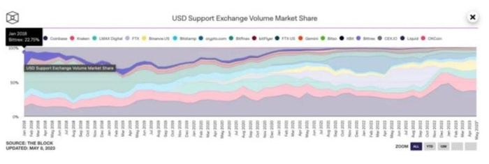 (世界主要加密货币交易所美元⽀持现货交易市场份额,紫色为Bittrex 来源:The Block)