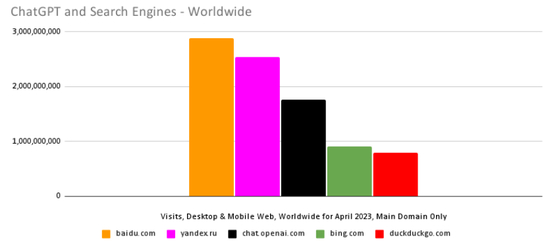 某种程度上,这也反映出ChatGPT本身已经达到互联网领域相当靠前的位置,超过了纽约时报、CNN等长期经营的平台。哪怕与流量经济的金字塔尖——搜索引擎产业相比,ChatGPT也超越了必应和在美国颇有人气的搜索引擎DuckDuckGo。虽然与谷歌差距仍非常大,但ChatGPT的流量已经能与百度和俄罗斯搜索引擎Yandex画在同一张图表中。