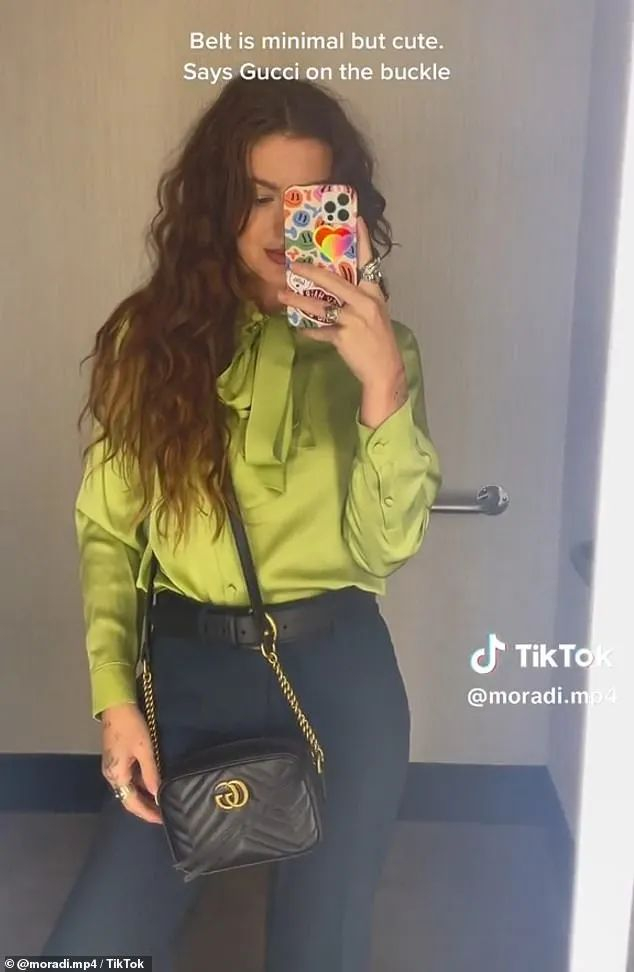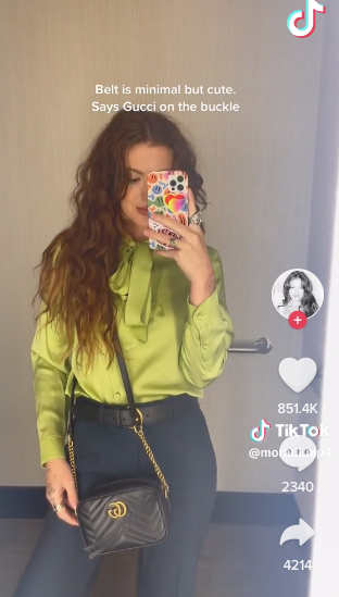 4月4日,梅拉尼在tiktok上晒出了自己身背巨大绿色Gucci购物袋对镜自拍的视频。